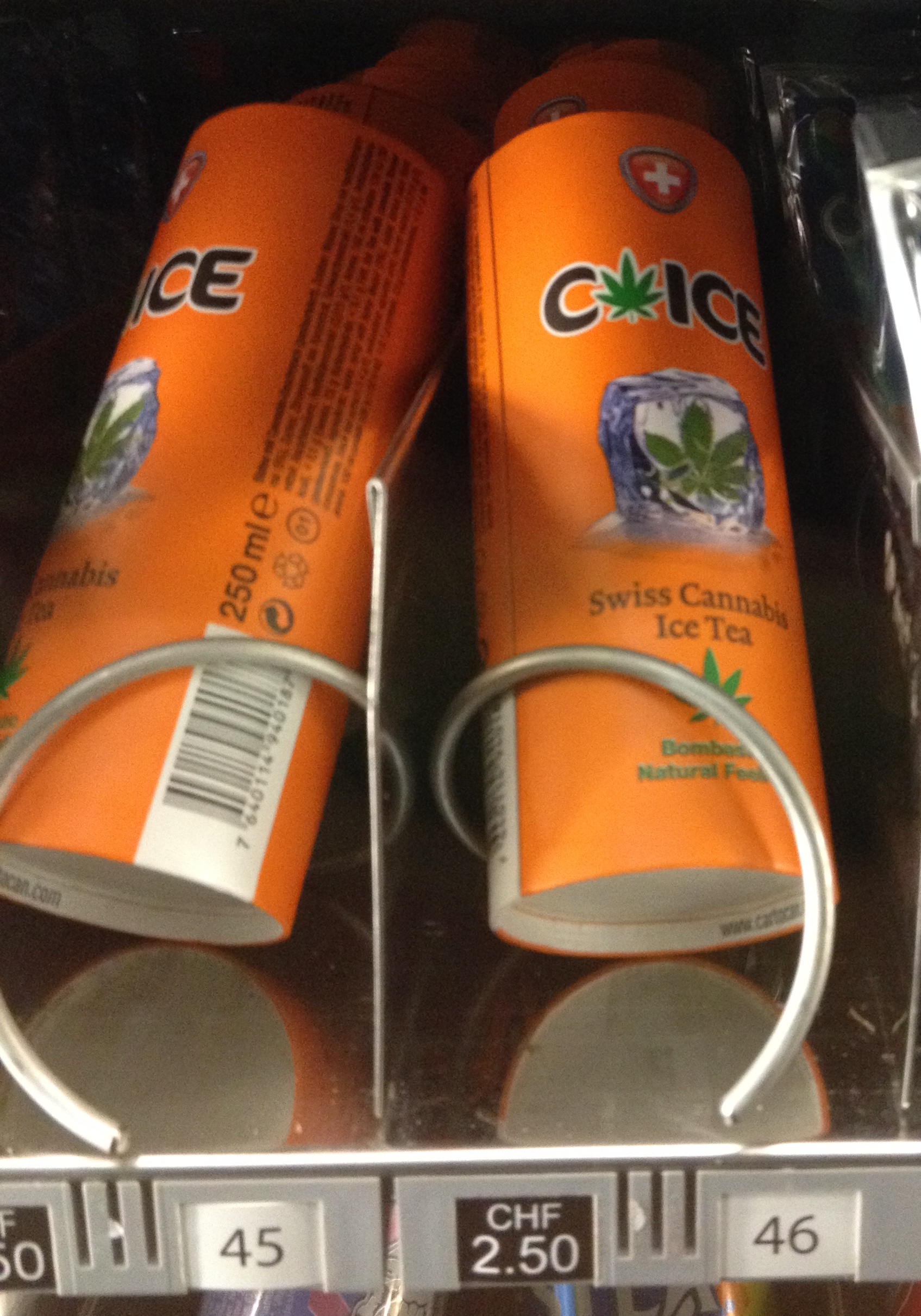 Lo primero que llamó mi atención entre todos los refrescos y comida basura que había en la primera máquina de vending que me encontré fue una lata de C ICE – “Swiss Cannabis Ice Tea”. Sí, señores, té helado de marihuana. Rico, rico, que diría el amigo Karlos Arguiñano.