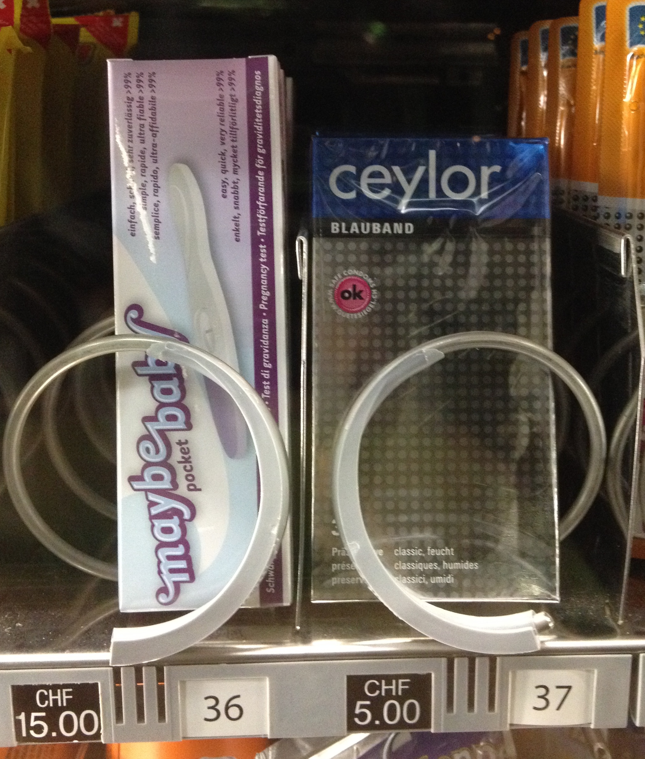Tengo que confesarlo. Mi artículo favorito entre todos los que vi aquella mañana en la máquina de vending fue sin duda alguna ¡el test de embarazo! La venta de este tipo de producto en una máquina de vending está más que justificada porque una nunca sabe cuándo va a necesitar uno. Quizá una mujer muy, muy ocupada aprovecha hasta el viaje en tren a Zürich para salir de dudas (en el servicio del tren…)