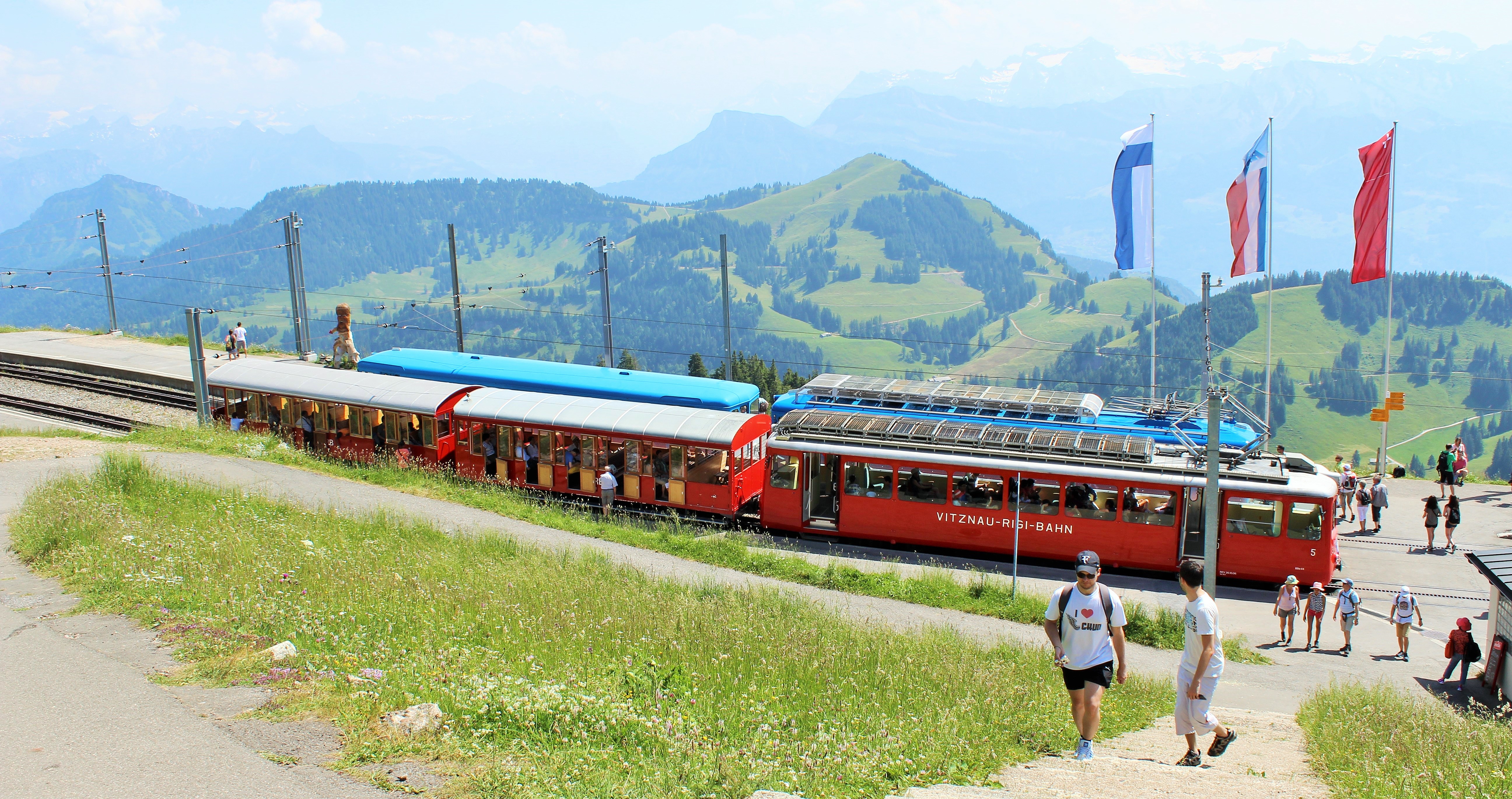 Partiendo desde Vitznau, un pueblo con mucho encanto situado a orillas del Lago -que aprovechamos para darnos un bañito previo a la subida-, cogimos el tren cremallera que llega hasta la cima y que conserva todo el encanto del que fue el primer tren cremallera de Europa, inaugurado allá por 1.871.