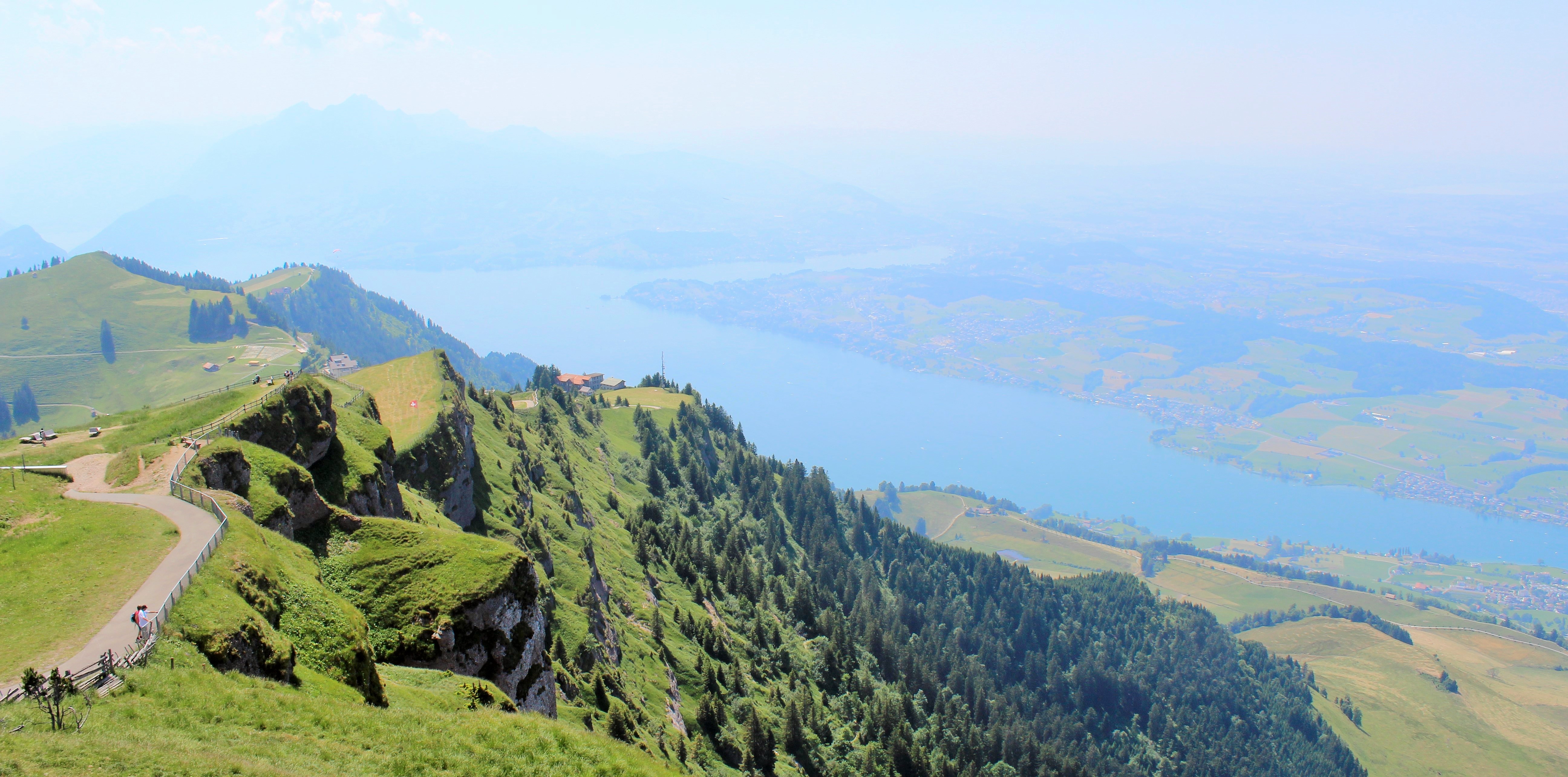Una vez en la cumbre, recorrimos el camino-mirador que ofrece unas vistas casi, casi 360° y permite disfrutar de hasta 13 lagos, la ciudad de Lucerna, los Alpes a un lado y la inmensa llanura que se extiende desde su falda hasta Alemania y Francia al otro. Y es que, si bien el Rigi no impresiona por su altitud de «tan solo» 1,797 metros, su ubicación en la península que dibujan las caprichosas orillas del Lago de Lucerna convierten su cima en un lugar perfecto para contemplar el paisaje.