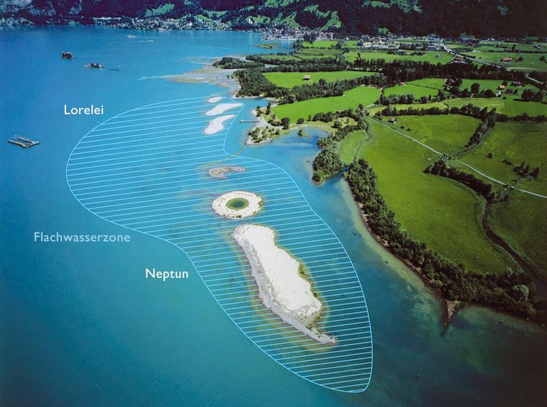 En concreto, el conjunto de islas Neptune y Lorelei -poético nombre que recibe cada grupo de islas- son la acumulación de más de 3,3 millones de toneladas de grava extraída del mismísimo túnel de San Gotardo que dieron lugar a tres islas, en una primera fase, y otras tres como resultado de la última ampliación del túnel.