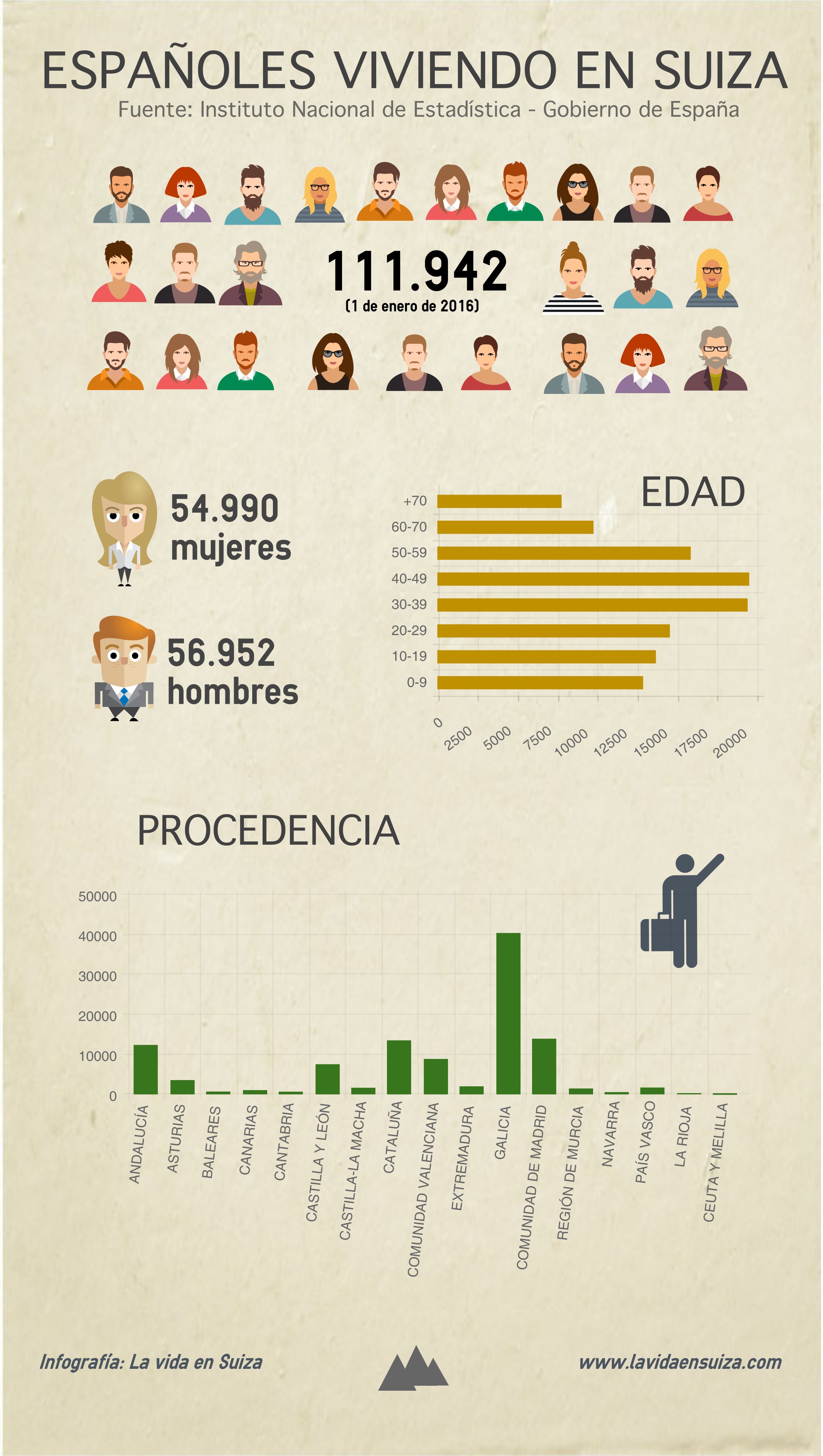 Pero, ¿cuántos españoles residen actualmente en Suiza? ¿Qué edad tienen? ¿De dónde vienen? Para arrojar un poco de luz sobre el tema, he diseñado la siguiente infografía cuyas conclusiones procedo a comentar a continuación.