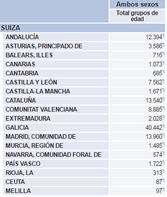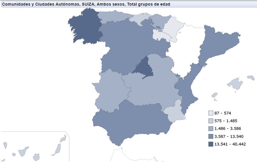 En cuanto a la procedencia, Galicia gana por goleada como comunidad exportadora de españoles con un total de 40.442 galleguiños viviendo en Suiza, seguida de Madrid y Cataluña, que aportan casi 14.000 y en torno a 13.500, respectivamente, y Andalucía pisándole los talones con 12.394 compadres residiendo en la Confederación.