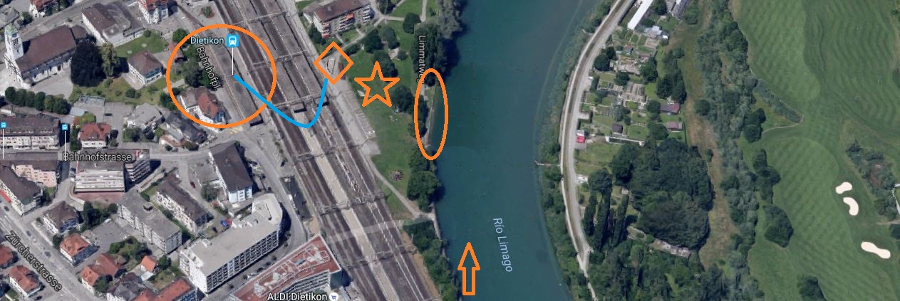Final del recorrido: ambos trayectos finalizan a la altura de la estación de tren de Dietikon, donde veréis una zona perfecta para salir del río. Al lado (marcado por una estrella) hay un lugar idóneo para secar la barca y desinflarla, además de un buen sitio para quedarse un rato, comer… o simplemente recoger nuestras cosas y volver a Zürich. El acceso a la estación está ahí al lado (marcado por el rombo) y es muy sencillo.