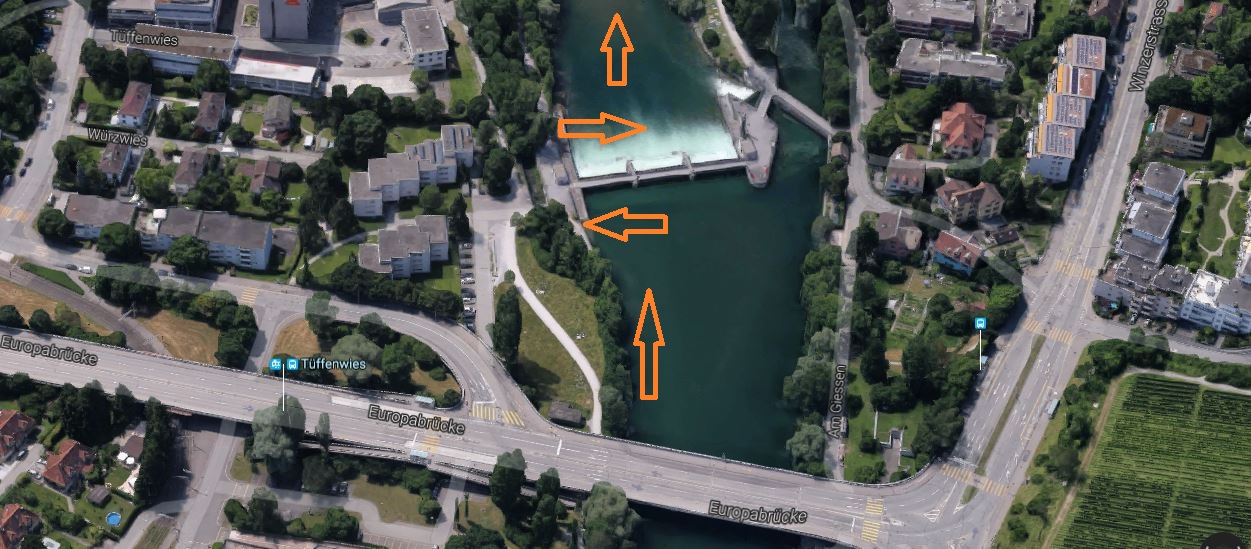 1.- Del Wipkinger Park a Dietikon > Accederemos al río en Wipkinger Park (donde podremos hinflar cómodamente la barca o flotador) y saldremos del agua antes de llegar a Werdinsel, pequeña «isla» en la que el río se bifurca. Como veréis al aproximaros, pues está bien señalizado, hay que salir por una rampa que hay en el margen izquierdo del río y antes de llegar a una pequeña presa imposible de sortear por el agua.
