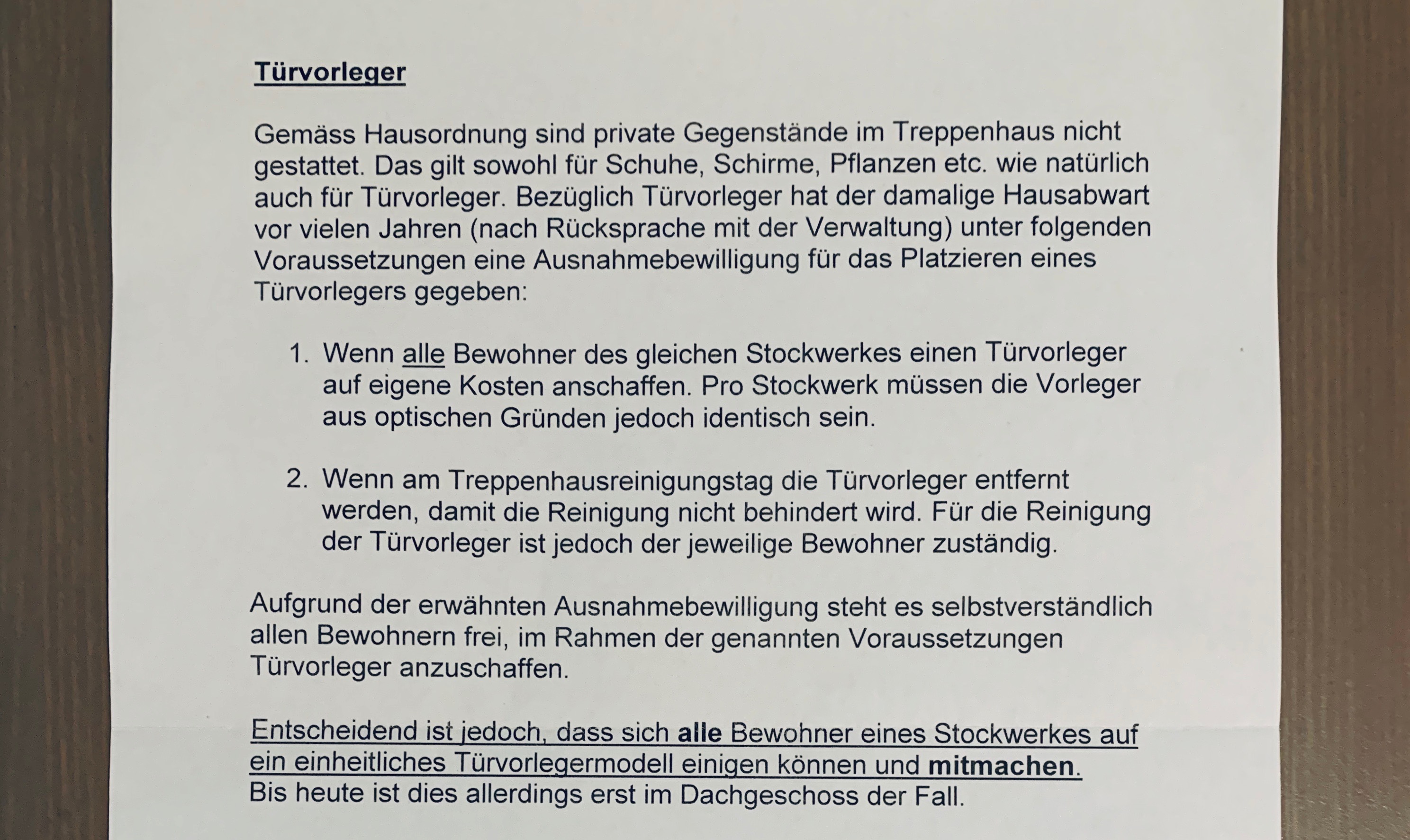 5. Para vuestra tranquilidad, en nuestra comunidad (cooperativa de viviendas) todos los vecinos tenemos el mismo felpudo, propiedad de la casa. Si alguien pone uno algo diferente, que no llame demasiado la atención, no pasa nada? Se ve que llevais poco tiempo por aquì, ya os iréis acostumbrando a estas cosas. Suiza y España, son dos mundos muy diferentes. Es así.