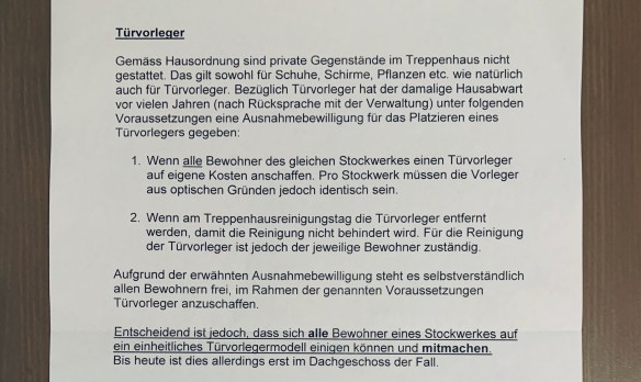 Leyendo la traducción de Google Translator no podía dejar de pensar que tenía que ser una broma, la típica broma que te gastan los vecinos cuando te acabas de mudar para romper el hielo, entrar en conversación y echarse una risas –qué susto joder, ya pensaba que estábais todos loquers y tal… jaja… jaja…– pero NEIN, estando en Suiza las posibilidades de que algo así sea una broma se reducen a 0. No había de otra: estábamos ante una Ley del Felpudo.